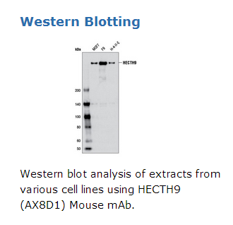 HECTH9 (AX8D1)鼠单抗是通过表达的与HECTH9序列一致的特异性重组蛋白免疫动物获得。 Western blot analysis of extracts from various cell lines using HECTH9 (AX8D1) Mouse mAb. 使用HECTH9 (AX8D1)鼠单抗对不同细胞裂解物进行免疫印迹分析的结果。