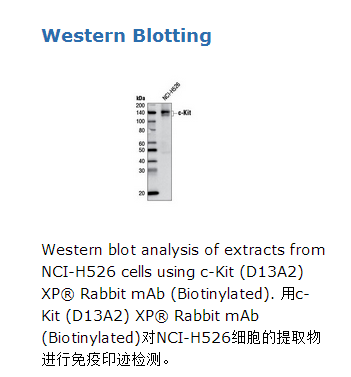 c-Kit (D13A2) XP® Rabbit mAb (Biotinylated) detects endogenous levels of total c-Kit protein. It does not cross-react with other receptor tyrosine kinase family members.