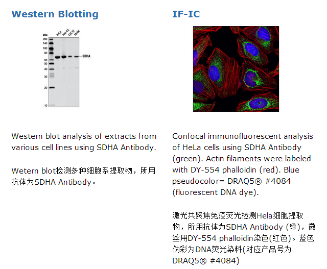 Polyclonal antibodies are produced by immunizing animals with a synthetic peptide corresponding to residues near the carboxy terminus of human SDHA protein. Antibodies are purified by protein A and peptide affinity chromatography.