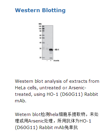 HO-1 (D60G11) Rabbit mAb用于检测内源性HO-1总蛋白水平。该单抗通过用对应于人源HO-1蛋白Ala110位点周围残基序列的合成肽免疫动物制备而得。血红素氧合酶(HO)是血红素分解代谢过程中的限速酶,该反应会释放一氧化碳,铁离子和胆绿素(1)。该反应的产物对多种生理功能如抗氧化反应,抗炎症反应和细胞保护功能至关重要(2)。HO包括两种同工酶,包括组成型表达的HO-2和诱导型的HO-1(3)。在受到一些刺激,包括血红素,金属离子和激素等,诱导型的HO-1会表达(4)。HO-1的诱导表达跟多种疾病有关,如移植排斥,高血压,动脉硬化,Alzheimer病,内毒素休克,糖尿病,炎症和神经疾病等(1,5)。