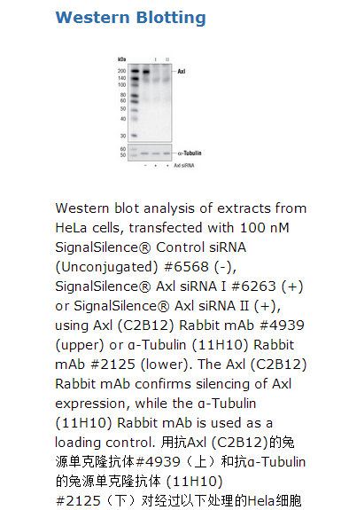 SignalSilence® Axl siRNA II from Cell Signaling Technology (CST) allows the researcher to specifically inhibit Axl expression using RNA interference, a method whereby gene expression can be selectively silenced through the delivery of double stranded RNA molecules into the cell. All SignalSilence® siRNA products from CST are rigorously tested in-house and have been shown to reduce target protein expression by western analysis.