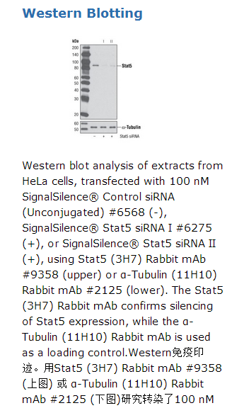SignalSilence® Stat5 siRNA II from Cell Signaling Technology (CST) allows the researcher to specifically inhibit Stat5 expression using RNA interference, a method whereby gene expression can be selectively silenced through the delivery of double stranded RNA molecules into the cell. All SignalSilence® siRNA products from CST are rigorously tested in-house and have been shown to reduce target protein expression by western analysis.