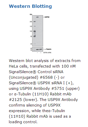 Western blot analysis of extracts from HeLa cells, transfected with 100 nM SignalSilence® Control siRNA (Unconjugated) #6568 (-) or SignalSilence®USP9X siRNA I (+), using USP9X Antibody #5751 (upper) or α-Tubulin (11H10) Rabbit mAb #2125 (lower). The USP9X Antibody confirms silencing of USP9X expression, while theα-Tubulin (11H10) Rabbit mAb is used as a loading control.