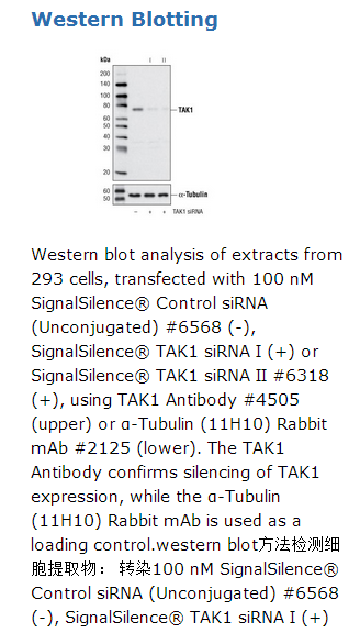 CST recommends transfection with 100 nM TAK1 siRNA I 48 to 72 hours prior to cell lysis. For transfection procedure, follow protocol provided by the transfection reagent manufacturer. Please feel free to contact CST with any questions on use.