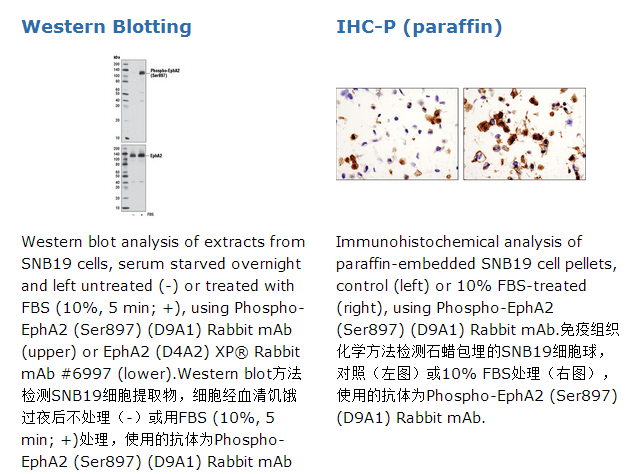 只有当丝氨酸(897位)磷酸化时,磷酸化EphA2 (Ser897) (D9A1) 兔单抗能够识别内源性水平的EphA2蛋白。该单克隆抗体通过用合成磷酸肽免疫动物制备,该合成磷酸肽是人EphA2蛋白丝氨酸(897位)附近的残基。Eph受体是研究的最为清楚的酪氨酸激酶受体家族(RTKs)。根据其序列的相似性和一子集配体的倾向性可将它们分为两组:结合基磷脂酰肌醇锚定的麻黄素A配体的EphA受体; 结合具有跨膜区和胞内区的麻黄素B蛋白的EphB 受体(1,2)。Eph 受体及其配体与多种疾病相关,包括肿瘤(3)。Eph A 和B配体都有双重功能。作为RTK配体,麻黄素激活Eph受体的激酶活性以及激活表达该受体细胞的信号通路。麻黄素的胞外区的聚集足以完成这项功能(4)。麻黄素的第二项功能称为“反向信号调节”,凭借胞内区的酪氨酸磷酸化,能够与表达配体的细胞中许多激活信号通路的其它蛋白相互作用(5)。许多刺激都能使麻黄素B的酪氨酸位点磷酸化,包括与麻黄素B受体结合、Src激酶的激活以及受PDGF和 FGF刺激 (6)。酪氨酸 324/327的磷酸化被认为是体内麻黄素 B1的主要磷酸化位点(7)。已经证明,EphA2的过表达导致的配体依赖促进细胞迁移需要由Akt磷酸化EphA2磷酸化丝氨酸(897位)。另一方面,用其配体Ephrin-A1刺激EphA2,通过生长因子取消Akt的活化,导致EphA2在丝氨酸(897位)去磷酸化(8)。