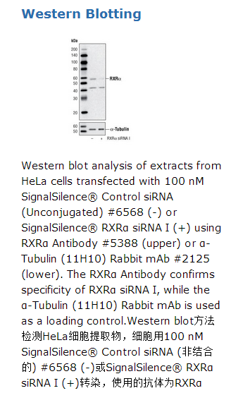 SignalSilence® RXRα siRNA I from Cell Signaling Technology (CST) allows the researcher to specifically inhibit RXRα expression using RNA interference, a method whereby gene expression can be selectively silenced through the delivery of double stranded RNA molecules into the cell. All SignalSilence® siRNA products from CST are rigorously tested in-house and have been shown to reduce target protein expression by western analysis.