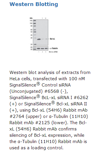 CST recommends transfection with 100 nM Bcl-xL siRNA II 48 to 72 hours prior to cell lysis. For transfection procedure, follow protocol provided by the transfection reagent manufacturer. Please feel free to contact CST with any questions on use.