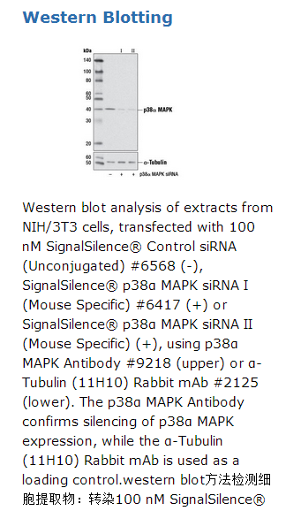CST recommends transfection with 100 nM p38α MAPK siRNA II (Mouse Specific) 48 to 72 hours prior to cell lysis. For transfection procedure, follow protocol provided by the transfection reagent manufacturer. Please feel free to contact CST with any questions on use.