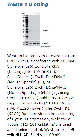 CST recommends transfection with 100 nM Cyclin D1 siRNA I (Mouse Specific) 48 to 72 hours prior to cell lysis. For transfection procedure, follow protocol provided by the transfection reagent manufacturer. Please feel free to contact CST with any questions on use.