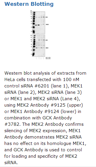 CST的SignalSilence® MEK2 siRNA可以帮助研究者通过RNA干扰特异性地抑制MEK2的表达,这种方法可以通过将双链RNA分子传递到细胞内从而使基因表达有选择的沉默。来自CST的所有的SignalSilence® siRNA产品都是经过内部严格检测的,并且通过Western blot 分析证明确实能够减少目的蛋白的表达。CST推荐使用100 nM SignalSilence® MEK2 siRNA 进行转染,48到72小时后对细胞进行裂解。转染步骤按照转染试剂说明书提供的步骤进行。MEK1、MEK2,也被称为MAPK或Erk激酶,它们是双特异性蛋白激酶,在丝裂原活化蛋白激酶级联反应中发挥作用,控制细胞生长和分化(1-3)。MEK1、MEK2的活化是通过Raf样分子对两个丝氨酸(217 /221位点)的磷酸化而实现的,这两个丝氨酸位点位于亚结构域VIII的活化环内。多种生长因子和细胞因子以及膜去极化和钙内流都能激活MEK1/2(1-4)。组成型活化的MEK1/2能够诱导NIH/3T3细胞的转化和PC-12细胞的分化(4)。MEK蛋白通过将p44、p42 MAPK激酶上位于亚结构域VIII的活化环内的丝氨酸和苏氨酸磷酸化,激活p44、 p42 MAPK激酶。小干扰RNA(siRNA)被用于特异性沉默HEK293T细胞中MEK2的表达(5)。