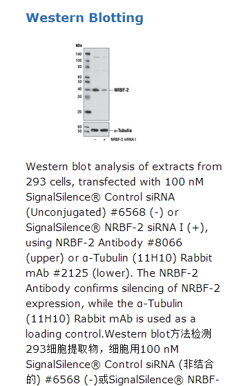 .CST SignalSilence® NRBF-2 siRNA I允许研究者使用RNA干扰技术特定地抑制NRBF-2表达,使用这种方法可以将双链RNA分子转至细胞内,选择性沉默基因的表达。所有CST SignalSilence® siRNA产品都经过严格的内部测试,并用western方法检测证明可以降低靶蛋白的表达。通过三苯甲基分析每个碱基以监测寡核苷酸的合成,确保合适的配对效率。随后,该寡核苷酸通过亲和固相萃取纯化。退火的RNA双链进一步通过质谱法进行分析,验证双链的确切成分。通过质谱,将每批结果与之前的批次比较,以确保批次间最大的一致性。CST建议在细胞裂解前48-72h,用100 nM NRBF-2 siRNA I进行转染。转染程序参照转染试剂制造商所提供的操作指南。在使用上有任何问题,请随时联系CST。核受体结合因子-2(NRBF-2)也被称为PPAR和RXRα-2(COPR-2)的共调节子,已证明它与一些核激素受体AF-2区域有不同的亲和力,如PPARα、RARα、 RARγ 和RXRα(1,2)。 NRBF-2包含一个LLYLL模体,与LXXLL NR框相匹配,对于功能性NRBF-2/核受体复合物的形成和抑制受体功能是需要的。NRBF-2还包含一个独特的自主激活结构域,因此不能完全去除核受体的功能,这表明NRBF-2可能作为一个分子可变电阻器,以微调已配位核受体的转录活性(1,2)