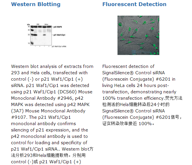 SignalSilence® p21 Waf1/Cip1 siRNA (Human Specific) allows the researcher to specifically inhibit p21 Waf1/Cip1 expression using RNA interference, a method in which gene expression can be selectively silenced through the delivery of double stranded RNA molecules into the cell. All SignalSilence® siRNA products from Cell Signaling Technology are rigorously tested in-house and have been shown to reduce protein expression in specified cell lines