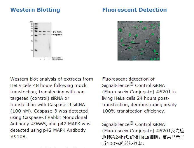 CST recommends transfection with 100 nM Caspase-3 siRNA. Decreased Caspase-3 expression was observed 24-72 hours post-transfection. See Protocol for transfection procedure.