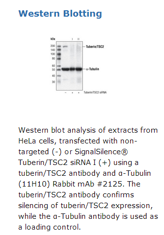 Tuberin is a product of the TSC2 tumor suppressor gene and an important regulator of cell proliferation and tumor development (1). Mutations in either TSC2 or the related TSC1 (hamartin) gene cause tuberous sclerosis complex (TSC), an autosomal dominant disorder characterized by development of multiple, widespread non-malignant tumors (2). Tuberin is directly phosphorylated at Thr1462 by Akt/PKB (3). Phosphorylation at Thr1462 and Tyr1571 regulates tuberin-hamartin complexes and tuberin activity (3-5). In addition, tuberin inhibits the mammalian target of rapamycin (mTOR), which promotes inhibition of p70 S6 kinase, activation of eukaryotic initiation factor 4E binding protein 1 (4E-BP1, an inhibitor of translation initiation), and eventual inhibition of translation (3,6,7).Small interfering RNA (siRNA) has been used to specifically silence tuberin in HEK293 cells (7).