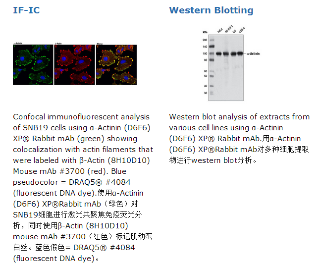 α-Actinin (D6F6) XP®Rabbit mAb可以识别内源性总的α-actinin 蛋白。单克隆抗体由合成肽段免疫动物产生,该肽段与人α-actinin蛋白316位苯丙氨酸附近氨基酸一致。α-Actinin属于细胞骨架蛋白pectrin家族。它最早被发现作为actin交联蛋白,形成反向同二聚体,互相结合在氨基末端。最近,α-actinin被发现可以与大量的涉及细胞骨架信号通路的蛋白相结合,包括那些涉及到细胞黏附,迁移和免疫细胞应激的过程(1)。α-actinin与细胞间黏附分子-5(ICAM-5)帮助促进神经突出的增生(2)。在成骨细胞中,α-actinin和integrins结合稳定黏着斑可能会保护细胞不发生凋亡(3)。α-actinin的1和4亚型,是非肌肉亚型,在压力纤维、黏附和细胞间联系,丝状伪足和板状伪足的部位被发现。肌肉亚型2和3位于肌肉的Z显带和平滑肌的致密斑(1)。