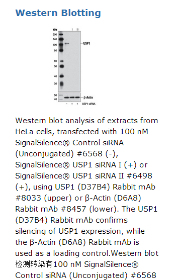 SignalSilence® USP1 siRNA I from Cell Signaling Technology (CST) allows the researcher to specifically inhibit USP1 expression using RNA interference, a method whereby gene expression can be selectively silenced through the delivery of double stranded RNA molecules into the cell. All SignalSilence® siRNA products from CST are rigorously tested in-house and have been shown to reduce target protein expression by western analysis.