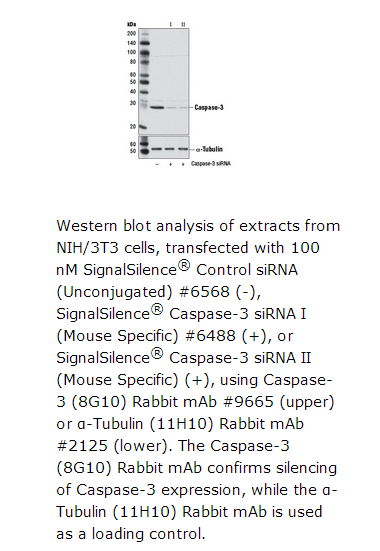 CST recommends transfection with 100 nM SignalSilence® Caspase-3 siRNA II (Mouse Specific) 48 to 72 hours prior to cell lysis. For transfection procedure, follow protocol provided by the transfection reagent manufacturer. Please feel free to contact CST with any questions on use.