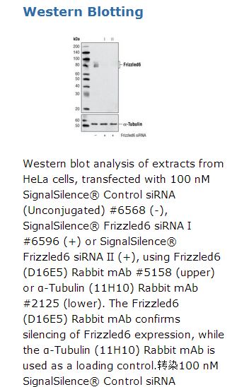 CST recommends transfection with 100 nM Frizzled6 siRNA II 48 to 72 hours prior to cell lysis. For transfection procedure, follow protocol provided by the transfection reagent manufacturer. Please feel free to contact CST with any questions on use.。