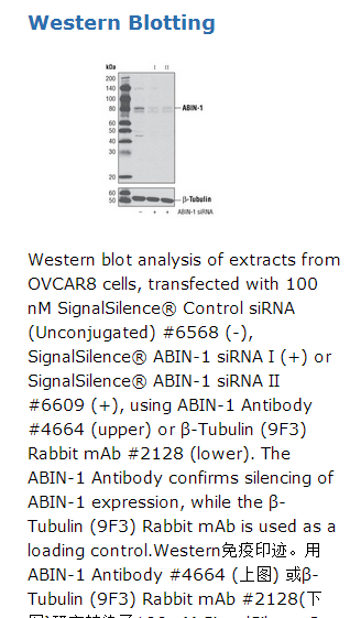 SignalSilence® ABIN-1 siRNA I from Cell Signaling Technology (CST) allows the researcher to specifically inhibit ABIN-1 expression using RNA interference, a method whereby gene expression can be selectively silenced through the delivery of double stranded RNA molecules into the cell. All SignalSilence® siRNA products from CST are rigorously tested in-house and have been shown to reduce target protein expression by western analysis.