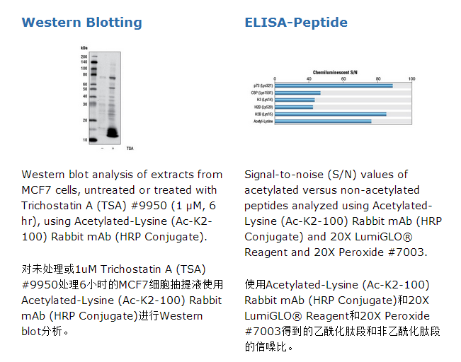 This Cell Signaling Technology®antibody is conjugated by the covalent reaction of hydrazinonicotinamide-modified antibody with formylbenzamide-modified horseradish peroxidase (HRP). The HRP conjugated antibody is expected to exhibit the same species cross-reactivity as the unconjugated Acetylated-Lysine (Ac-K2-100) Rabbit mAb #9814.