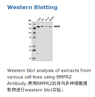 BMPR2抗体可以识别内源性的总BMPR2蛋白。该抗体会产生一条115Kd的非特异性条带。合成与人BMPR2蛋白邻近 Lys763氨基酸残基序列一致的肽段,免疫动物获得单克隆抗体。抗体通过蛋白A和肽亲和层析纯化。BMPR2是一种II型丝氨酸/苏氨酸受体激酶,可以结合一系列分泌型骨形成蛋白(BMPs)。BMPs是一类属于TGF-β超家族的配体,介导原肠胚形成,神经发生,软骨形成,interdigital细胞死亡和骨骼形成(1-5)。不同于TGF-β type II受体,BMPR2包含一个延伸的羧基末端区域,能够与各种信号分子结合介导BMPs靶基因的反应(6,7)。BMP信号需要I型和II型受体聚合以引发靶基因的功能反应。BMP结合到I型和II型受体将导致Smad1/5/8磷酸化,这种磷酸化对于靶基因的激活是必需的(7)。体外和体内证据都显示BMPR2缺陷会导致肺动脉高血压,炎症反应和内皮损伤(8,9)。