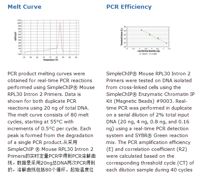SimpleChIP® Mouse RPL30 Intron 2 Primers contain a mix of forward and reverse PCR primers that are specific to intron 2 of the mouse RPL30 gene. These primers can be used to amplify DNA that has been isolated using chromatin immunoprecipitation (ChIP). Primers have been optimized for use in SYBR® Green quantitative real-time PCR and have been tested in conjunction with SimpleChIP® Enzymatic Chromatin IP Kits #9002 and #9003 and ChIP-validated antibodies from Cell Signaling Technology®. The RPL30 gene is actively transcribed in all cell types and its promoter is highly enriched for histone modifications associated with active transcription, such as histone H3 Lys4 tri-methylation and general histone acetylation. This gene promoter shows very low levels of histone modifications associated with heterochromatin, such as histone H3 Lys9 and Lys27 tri-methylation.