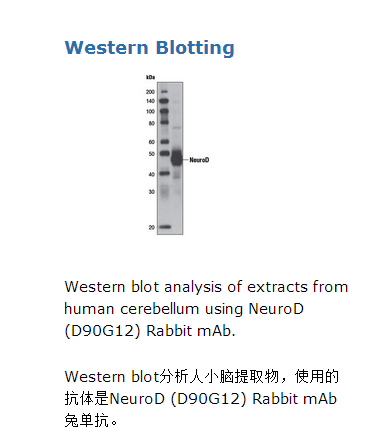 NeuroD (D90G12)Rabbit mAb 兔单抗识别内源性的总NeuroD蛋白。该单克隆抗体由合成的人类NeuroD蛋白氨基末端附近肽段免疫动物而制成。NeuroD是基本的螺旋 - 环 - 螺旋(bHLH)转录因子家族成员。这些蛋白质与E蛋白形成异二聚体,结合经典的E盒序列CANNTG(1,2)。CaMKII介导NeuroD的Ser336磷酸化,这是树突形成和增长所必需的(3,4)。NeuroD的Ser274也可磷酸化,其结果根据磷酸化的酶不同而不同,胰腺β细胞中ERK的磷酸化促进NeuroD活性,神经元中GSK-3β的磷酸化抑制NeuroD活性(3)。NeuroD在胰腺和发育中的神经系统是至关重要的,在内耳和哺乳动物的视网膜的发育中起着很大的作用(3)。缺乏NeuroD的小鼠会发生严重的糖尿病,因缺乏β细胞的分化而在出生不久即死亡(2,3,5,6)。脑内缺乏NeuroD将导致严重的发育障碍(5)。人类该基因突变与I型糖尿病和年轻成年发病的糖尿病有关(1,3)。