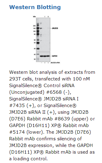 CST recommends transfection with 100 nM SignalSilence® JMJD2B siRNA II 48 to 72 hours prior to cell lysis. For transfection procedure, follow protocol provided by the transfection reagent manufacturer. Please feel free to contact CST with any questions on use.