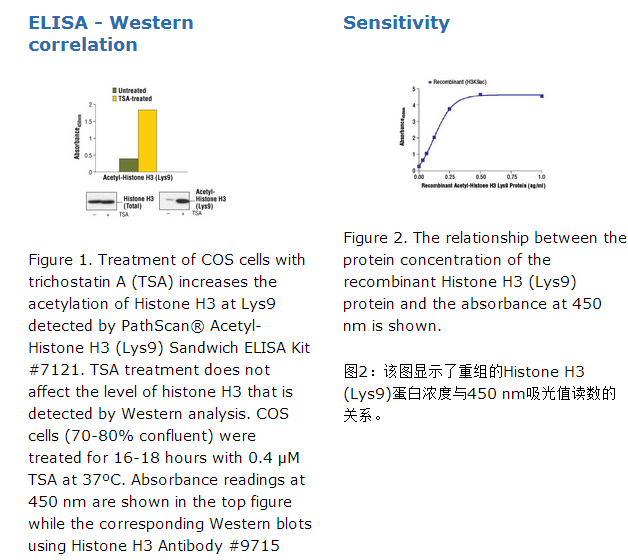 PathScan® Acetyl-Histone H3 (Lys9) Sandwich ELISA Kit #7121能够检测内源性Lys9位点乙酰化的Histone H3的蛋白水平。如图1所示,使用Acetyl-Histone H3 (Lys9) Sandwich ELISA Kit #7121,当COS细胞TSA处理后,Histone H3蛋白Lys9位点的高水平乙酰化被检测。histone H3 (修饰和未修饰)总蛋白水平通过免疫印迹(western blot)分析显示没有变化。使用TSA处理的NIH/3T3和Jurkat细胞显示类似的结果(数据未显示)。因为通过内部实验确定,该试剂盒检测已表明的物种,但是可能也会检测其它物种的同源性蛋白。该PathScan® Acetyl-Histone H3 (Lys9) Sandwich ELISA Kit是一个固相夹心酶联免疫吸附法,其能检测内源性Lys9位点乙酰化的Histone H3蛋白。一个Acetyl-Histone H3 (Lys9) Rabbit Antibody已经被包被在微孔板上。在与细胞裂解液一起孵化后,acetyl-histone H3 (Lys9)蛋白被包被的抗体吸附。全面清洗之后,一个biotinylated Histone H3 Rabbit Antibody被加入去检测Histone H3蛋白。然后,HRP-linked streptavidin被用于识别已结合的检测抗体。HRP底物(TMB)加入后显色。该显色的吸光度值的大小与在Lys9位点乙酰化的Histone H3蛋白量成正比例。试剂盒里的抗体是针对该试剂盒特定制备的。染色质结构的修饰在调节真核细胞的转录中扮演着重要的角色。由DNA围绕和八聚体组蛋白(H2A,H2B,H3和H4各两个)共同组成的核小体是染色质的主要组成(1)。核小体的组蛋白氨基酸尾端进行不同的转录后修饰,包括乙酰化,磷酸化,甲基化和泛素化(2-5)。这些修饰通过不同的刺激产生并且对转录因子能否接近染色质有着直接的影响,所以也影响着基因的表达(6)。在大多数的物种中组蛋白H2B主要在Lys5,,12,,15和20位点上发生乙酰化(4,7)。组蛋白H3主要是在Lys9,14,18,23,27和56位点上发生乙酰化。在某些物种里H3上的Lys9位点发生乙酰化并应该在组蛋白沉积和染色质组装中扮演着重要的角色(2,3)。组蛋白H3上Ser10,Ser28和Thr11位点的磷酸化在有丝分裂和无丝分裂中都与染色质的缩合紧密相连(8-10)。H3的Thr3位点的磷酸化在许多物种中都是高度保守的,是由kinase haspin所催化的。在哺乳动物中用磷酸化特异性的抗体做免疫组化显示H3的Thr3位点在有丝分裂的前期发生磷酸化,后期发生去磷酸化(11)。
