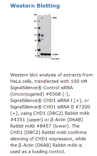 CST recommends transfection with 100 nM SignalSilence® CHD1 siRNA I 48 to 72 hours prior to cell lysis. For transfection procedure, follow protocol provided by the transfection reagent manufacturer. Please feel free to contact CST with any questions on use.