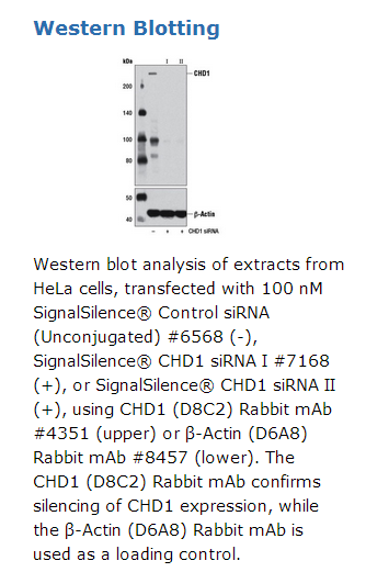 Cell Signaling Technology (CST)公司的SignalSilence® CHD1 siRNA II可以帮助研究者通过RNA干扰特异性地抑制CHD1蛋白表达,这种方法可以通过将双链RNA分子传递到细胞内从而使基因表达有选择的沉默。来自CST的所有的SignalSilence®siRNA产品都是经过内部严格检测的,并且通过Western blot 分析证明确实能够减少目的蛋白的表达。通过三苯甲基分析每个碱基以监测寡核苷酸的合成,确保合适的配对效率。随后寡核苷酸通过亲和固相萃取法纯化。退火的RNA双链通过质谱分析来证实其精确的组成。每一批产品都通过质谱分析与前面的产品进行比较,来保证不同批次之间的最大一致性。Chromodomain-helicase-DNA-binding domain (CHD)蛋白已经在多种生物中被鉴定(1,2)。由九个成员组成的蛋白家族已经被分为三个亚家族:subfamily I (CHD1和CHD2)、subfamily II (CHD3和CHD4)和subfamily III (CHD5、CHD6、CHD7、CHD8、CHD9)。所有CHD蛋白包含两个串联的N端chromodomains、一个SWI/SNF相关的ATPase结构域和一个C端DNA结合区域 (1,2)。chromodomains有助于结合到组蛋白的已甲基化赖氨酸残基,并且可与染色质的特异区域相互作用。SWI/SNF相关的ATPase区域可利用来自ATP水解的能量去修饰染色质结构。CHD1是一个常染色质蛋白,它与活化基因的启动子有关联,并且该蛋白对于在胚胎干细胞中染色质开放性和多能性的维持是需要的(3-6)。CHD1蛋白的两个chromodomains有助于它到活化基因的招募,该过程通过结合到histone H3的methyl-lysine 4位点,它是一个与转录激活相关联的标记物(4-6)。酵母CHD1蛋白是SAGA和SLIK组蛋白乙酰化转移酶复合物的一个成分,并且被认为在转录激活中联系着组蛋白甲基化和组蛋白乙酰化作用(6)。CHD2蛋白不具有明显特征;然而,小鼠基因敲除研究认为在发育和肿瘤抑制中有重要作用。纯合子CHD2敲除老鼠显示延迟生长和围产期致死(7)。杂合子敲除老鼠显示除了增加的髓外造血和易感性淋巴瘤之外,还出现死亡率增加和所有器官不正常(7,8)。CHD2突变细胞在造血干细胞分化中缺失,并且展示异常的DNA损伤反应(8)。