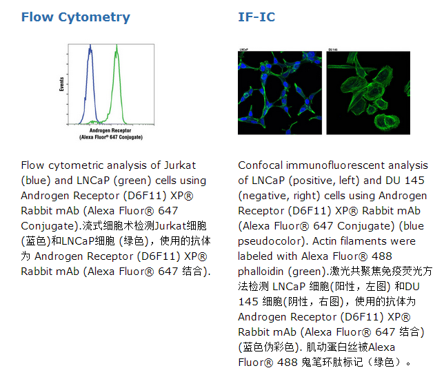 This Cell Signaling Technology antibody is conjugated to Alexa Fluor® 647 fluorescent dye and tested in-house for direct flow cytometric and immunofluorescent analysis in human cells. The antibody is expected to exhibit the same species cross-reactivity as the unconjugated Androgen Receptor (D6F11) XP® Rabbit mAb #5153.