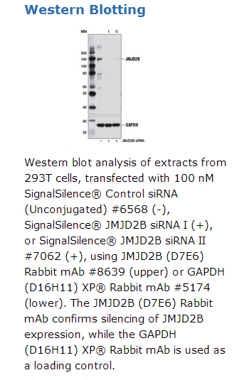 SignalSilence® JMJD2B siRNA I from Cell Signaling Technology (CST) allows the researcher to specifically inhibit JMJD2B expression using RNA interference, a method whereby gene expression can be selectively silenced through the delivery of double stranded RNA molecules into the cell. All SignalSilence® siRNA products from CST are rigorously tested in-house and have been shown to reduce target protein expression by western analysis.