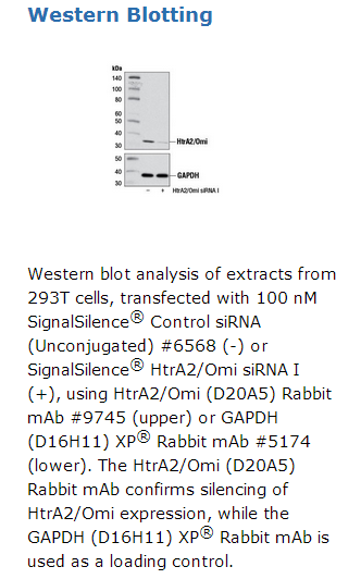 SignalSilence® HtrA2/Omi siRNA I inhibits human and monkey HtrA2/Omi expression.