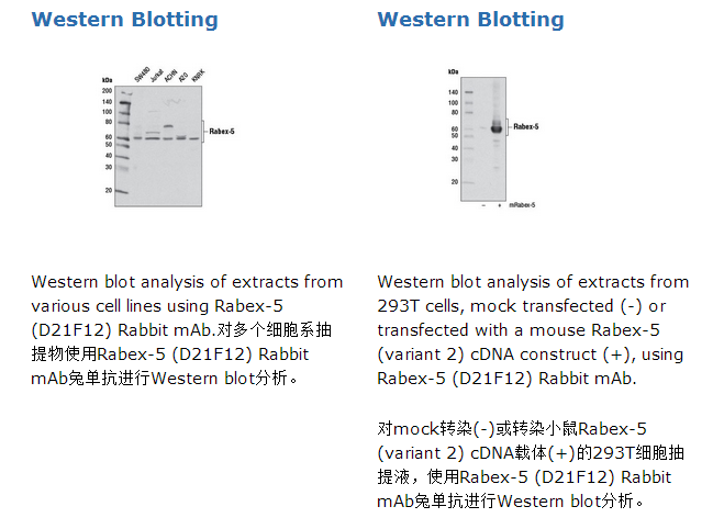 Rabex-5 (D21F12) Rabbit mAb兔单抗识别内源性的Rabex-5总蛋白水平。该单克隆抗体用与人类Rabex-5蛋白中羧基末端附近的氨基酸序列对应的人工合成肽段免疫动物而制成。Rabex-5也称为RabGEF1和RAP1,被确定为Rab5的鸟嘌呤核苷酸交换因子(GEF),是小Rab GTP酶Ras超家族的成员之一(1)。Rabex-5从产生GTP结合的活性形式的Rab5,并与其效应蛋白Rabaptin-5形成紧密连接(2)。这个复合物定位到内体膜,作为早期内吞中囊泡转运的关键调节者发挥作用(3,4)。Rabex-5也可以被单泛素化,并且有泛素连接酶活性以便被招募到早期内体(5,6)。Rab5在GTP/GDP状态下的构象改变对其生物学功能至关重要,因为其是内吞作用多个步骤中的一个速率限制调节者(5)。通过其对内体转运和入胞的控制,Rabex-5显示出对NGF介导的神经突生长和FcεRI依赖的肥大细胞活化的负向调节(8)。