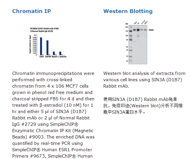 SIN3A (D1B7) Rabbit mAb兔单抗能够检测内源性SIN3A总蛋白水平。基于蛋白序列,该抗体不能与SIN3B蛋白发生交叉反应。通过人工合成人源SIN3A蛋白羧基端周围相应的多肽片段去免疫动物从而制备出此单克隆抗体。SIN3 起初被鉴定在出芽酵母中作为转录的负性调节因子(1,2)。自从那时起,SIN3蛋白的三个亚基在哺乳动物中被鉴定,如同两个不同基因产物一样SIN3A和SIN3B (3,4)。SIN3A和SIN3B都是细胞核蛋白,它们的功能是作为多亚单位SIN3转录抑制复合物的支架亚单位,该复合物包含SIN3A或SIN3B、HDAC1、HDAC2、SDS3、RBBP4/RBAP48、RBBP7/RBAP46、SAP30, and SAP18 (3,4)。SIN3蛋白包含四个paired amphipathic alpha-helix (PAH)结构域,该结构域通过结合大量DNA-结合转录抑制蛋白使SIN3复合物招募到靶基因上 ,而这些转录抑制蛋白包含Mad1、 p53、E2F4、HCF-1、AML1、Elk-1、NRSF、CTCF、ERα和MeCP2 (3,4)。因此,SIN3蛋白包含一个HDAC interaction domain (HID),该结构域通过SDS3桥接蛋白介导HDAC1和HDAC2的结合,以及在羧基端含有一个highly conserved region (HCR),该区域有助于抑制性蛋白质结合(3,4)。RBBP4和RBBP7蛋白也结合到SDS3,并且有助于核小体复合物的结合。SIN3复合物的功能去抑制转录,在部分程度上时通过靶基因启动子上的去乙酰化的组蛋白(3,4)。因此,最近研究证明SIN3被招募到抑制性和活性基因的编码区域,在该区域它能使组蛋白去乙酰化以及通过RNA polymerase II抑制假转录(3,5)。除了组蛋白去乙酰化酶活性之外,SIN3复合物与组蛋白甲基化转移酶(ESET)、组蛋白去甲基酶 (JARID1A/RBP2)、ATP依赖的染色质重塑(SWI/SNF)、甲基胞嘧啶双加氧酶(TET1)和O-GlcNAc transferase (OGT) 有关联,这些蛋白都有助于靶基因的调节(5-9)。SIN3复合物对于胚胎发育、细胞生长和增殖、凋亡、DNA复制、DNA修复和DNA甲基化(印记和x染色体失活)起着关键作用(3,4)。