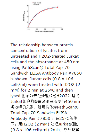 CST's PathScan® Total Zap-70 Sandwich ELISA Antibody Pair is being offered as an economical alternative to our PathScan® Total Zap-70 Sandwich ELISA Kit #7172. Capture and detection antibodies (100X stocks) and HRP-linked secondary antibody (1000X stock) are supplied. Sufficient reagents are supplied for 4 x 96 well ELISAs. The Zap-70 capture antibody is coated in PBS overnight in a 96 well microplate. After blocking, cell lysates are added followed by a Zap-70 detection antibody and anti-Rabbit IgG, HRP-linked antibody. HRP substrate TMB is added for color development. The magnitude of the absorbance for this developed color is proportional to the quantity of total Zap-70 protein.
