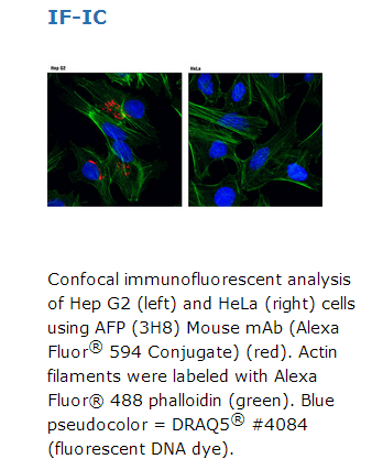AFP (3H8) Mouse mAb (Alexa Fluor®594 Conjugate) recognizes endogenous levels of total AFP protein.