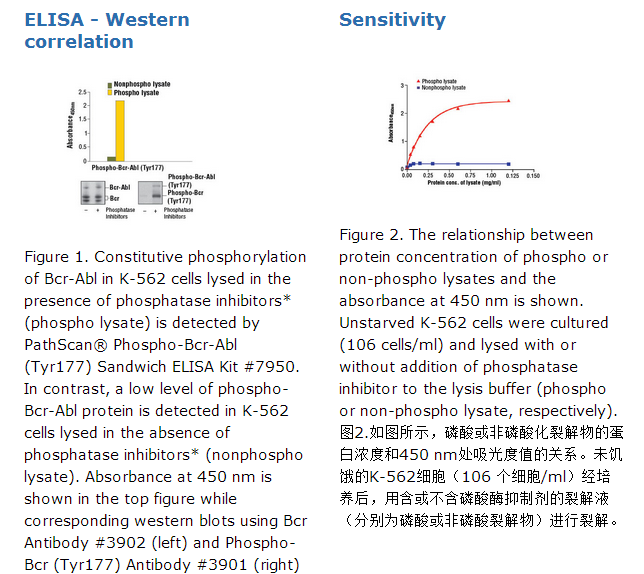 PathScan® Phospho-Bcr-Abl (Tyr177) Sandwich ELISA Kit #7950能够检测内源性的人细胞中酪氨酸177位点发生磷酸化的Bcr-Abl蛋白,见图1.试剂盒的灵敏性见图2. 本试剂盒用来检测指定物种的蛋白,即通过内部测试确定的指定物种蛋白,也可能检测来自其他物种的同源蛋白。Phospho-Bcr-Abl (Tyr177) Sandwich ELISA Kit是固相夹心酶联免疫吸附试验(ELISA),能够检测内源性水平的Bcr酪氨酸(177位)磷酸化的Bcr-Abl蛋白。c-Abl鼠单克隆抗体包被微孔板。细胞裂解液孵育后,Bcr-Abl和c-Abl蛋白(磷酸和非磷酸)由包被的抗体捕获。充分冲洗后,加入磷酸-Bcr (Tyr177)兔检测抗体检测捕获的酪氨酸磷酸化的Bcr-Abl和c-Abl蛋白。随后用抗兔IgG, HRP-标记的抗体识别结合的检测蛋白。加入HRP底物TMB进行显色。显色的吸光度值与酪氨酸(177位)磷酸化的Bcr-Abl蛋白的量成正比。试剂盒中的抗体是针对试剂盒定制的。Bcr基因最初是通过嵌合Bcr-Abl癌基因鉴定出来的(1)。Bcr氨基末端区域含有一个寡聚化结构域、一个丝氨酸/苏氨酸激酶结构域和一个与SH2结构域结合的区域。蛋白质的中间有一个PH结构域和一个序列类似于GTP结合蛋白Rho家族鸟嘌呤核苷酸交换因子的区域。羧基末端区域可能被参与了小GTP结合蛋白Rac的GTP酶激活功能(2,3)。野生型细胞中Bcr的功能尚不清楚。PDGF受体可能使用Bcr作为下游信号的调解器(4)。研究显示,Bcr-Abl融合导致组成性激活的酪氨酸激酶产生,从而导致慢性粒细胞性白血病(CML)(5)。Bcr-Abl融合蛋白中Bcr酪氨酸177位点被磷酸化,这在改变Bcr-Abl活性中发挥了重要作用(6)。磷酸化的酪氨酸177位点为Gab2和GRB2提供了停靠位点(7,8)。