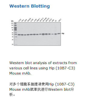 Hip (10B7-C3) Antibody 识别内源性的Hip (Hsc70互作)总蛋白水平。该单克隆抗体用与大鼠Hip蛋白氨基酸序列对应的人工合成肽段免疫动物而制成。Hip (Hsc70互作蛋白)蛋白也被称为ST13(肿瘤生成蛋白抑制物13),是若干共分子伴侣之一,可以调节HSP70分子伴侣家族的活性(1,2)。同源寡聚蛋白Hip在蛋白折叠中通过稳定HSP70的ADP结合状态与HSP70协同作用。当HSP70被HSP40家族转化为ADP结合状态时,Hip直接结合到HSP70的ATP酶结构域(3)。与其它正性共刺激因子如HSP40和Hop协调作用,或者与负性共刺激因子如Bag1竞争,Hip能促进HSP70在蛋白折叠和修复中的分子伴侣功能,并且能够控制调节性蛋白如固醇受体和多种增殖或凋亡相关的调节因子(4-8)。