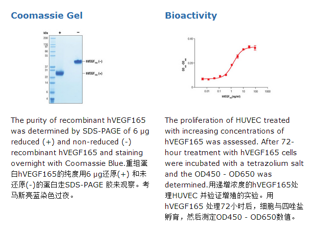 CST公司在人293细胞中生产重组人蛋白VEGF165 (hVEGF165) Ala207-Arg371 (Accession #NP_001020539)。重组的hVEGF165蛋白没有标签,未糖基化蛋白的分子量据推算为19,165Da。DTT-还原蛋白迁移时是作为24kDa 的多肽而转移。未还原的蛋白通过胱氨酸形成二聚体并作为40kDa 多肽而迁移。重组hVEGF165蛋白的N-末端APMAE的序列通过测序得到。6 μg 还原 (+) 和 非还原的(-) hVEGF165通过SDS-PAGE检测,纯度大于98%,所有批次的纯度均高于98%。重组蛋白hVEGF165的生物活性是通过HUVEC细胞的细胞增殖实验确定的。每个批次的ED50在1-6 ng/ml之间。