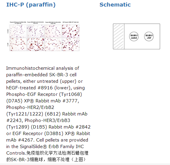 Each control slide contains formalin-fixed and paraffin-embedded SK-BR-3 cells, untreated and EGF-treated, that can serve as a control for immunostaining. Western blot analysis was performed on extracts derived from the same cells to verify treatment efficacy.