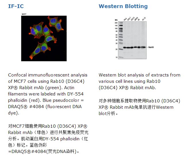Rab10 (D36C4) XP® Rabbit mAb兔单抗识别内源性Rab10总蛋白。该单克隆抗体用与人类Rab10蛋白中Gly190位点附近的氨基酸序列对应的人工合成肽段免疫动物而制成。Rab10是小Rab GTP酶Ras超家族的一员(1),可以与Mss4、myosin V(Va、Vb和Vc)和GDI相互作用,其介导细胞内体的分选(2-4)。在MDCK细胞对Rab10进行突变分析和GFP融合蛋白表达发现Rab10在早期内体和基底侧膜区域蛋白转运中发挥调节作用(5,6)。Rab10结合GLUT4复合物,作为AS160的靶标,并且为脂肪细胞中胰岛素刺激的GLUT4转位所需(7,8)。
