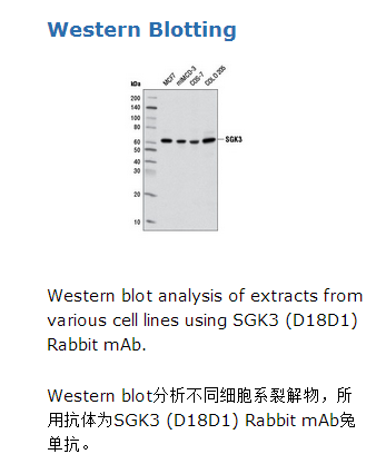 SGK3 (D18D1) Rabbit mAb兔单抗能够识别内源性SGK3总蛋白。该单克隆抗体是由合成的针对人SGK3蛋白Asp450周围相对应的残基的合成肽段免疫动物而生产的。血清和糖皮质激素诱导激酶(SGK)是一个丝氨酸/苏氨酸激酶,与Akt紧密联系(1)。SGK可以被多种刺激包括血清,糖皮质激素,卵泡刺激素,渗透压冲击和盐皮质激素迅速诱导。SGK可以被肝细胞生长因子HGF刺激的PI3K依赖的通路和整合素介导的PI3K非依赖的通路激活(2,3)。SGK的诱导和激活参与激活细胞抗凋亡和细胞周期调控(4-6)。SGK在钾,钠,氯离子通道激活中也起重要作用,表明其参与调控细胞的存活,神经元的兴奋,肾钠排泄等过程(2)。SGK被泛素化和蛋白酶体降解等过程负向调控(7)。SGK3是PI3K信号通路中的下游信号分子,它在Thr320位点被PDK1活化和磷酸化被提示为一种在肿瘤中Akt依赖的信号转导方式(8)。