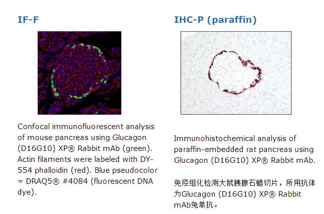 Glucagon (D16G10) XP® Rabbit mAb兔单抗用于检测内源性胰高血糖素总蛋白水平。该单抗通过用与人源胰高血糖素蛋白Ala137 位点周围残基序列相同的合成肽免疫动物制备而得。糖代谢受到多种激素的调节,其中之一就是胰高血糖素。在胰岛α细胞中,胰高血糖素由其前体原胰高血糖素通过水解而生成。胰高血糖素可以促进糖元的分 解,并且可以促进肝脏的糖异生作用(1,2)。