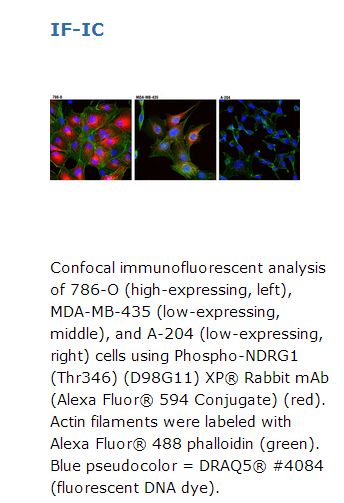 Phospho-NDRG1 (Thr346) (D98G11) XP®Rabbit mAb (Alexa Fluor® 594 Conjugate) detects endogenous levels of NDRG1 when phosphorylated at Thr346. This antibody likely cross-reacts with other conserved phosphorylation sites on NDRG1, such as Thr356 and Thr366.