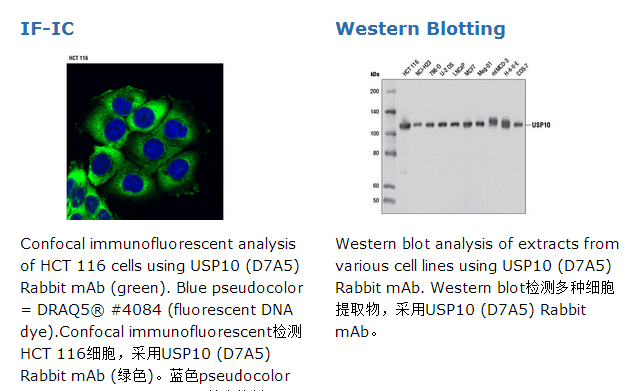 USP10 (D7A5) Rabbit mAb兔单抗识别内源性的USP10蛋白。该单克隆抗体是经合成与人USP10蛋白氨基末端邻近氨基酸残基序列一致的肽段,免疫动物产生。泛素化作用酶(UBEs)催化蛋白的泛素化,与去泛素化作用酶(DUB)的过程可逆(1,2)。5种DUB亚家族已经被确定,包括USP, UCH, OTU, MJD和JAMM酶。USP10具有与代表去泛素酶的USP家族的半胱氨酸和组氨酸盒子相匹配的氨基酸序列。在翻译后水平,USP10通过蛋白-蛋白相互作用和磷酸化被调节。确实,USP10与Ras-GAP SH3结构域结合蛋白(G3BP)的相互作用,可以抑制其催化泛素链分解的活性(3)。此外,ATM-介导的USP10的Thr42 和Ser337的磷酸化,可以促进USP10的稳定性和从胞质到核的重新分配,并在p53去泛素化、定位以及对具有遗传毒性压力应答的活性中发挥功效(4)。最近证实,USP10与USP13 和Vps34复合物具有相同的作用。USP10和USP13一起,呈现出对Vps34复合物的去泛素作用,进而调节III 类PI3K的水平。Beclin-1,这些复合物的其它组分,可以调节USP13的稳定性,能够去泛素化并稳定USP10的水平。因此,Beclin-1可以通过控制USP10的DUB活性间接地调节p53的稳定性(5)。USP10也在内涵室小体中起作用,在该小体中呈现出CFTR去泛素化作用,从而加强它的胞吞循环和细胞表面表达(6,7)。