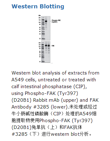 磷酸化FAK (酪氨酸397) (D20B1)兔源单抗仅仅在397位酪氨酸磷酸化时检测FAK蛋白,该蛋白可能与过表达酪氨酸磷酸化蛋白如EGFR有交叉反应。单抗由合成的磷酸化肽段免疫动物产生,该合成肽段对应人FAK 蛋白的397位酪氨酸附近残基。黏着斑激酶(FAK)是广泛表达的细胞质蛋白酪氨酸激酶,涉及整合素调控的信号转导,它在一些生物过程包括细胞扩散、转移和存活的控制中起重要作用(1)。FAK被整合素聚集而激活,导致在397位酪氨酸的自磷酸化,这是一个Src家族激酶PI3K和PL Cγ的结合位点(2-5)。Src家族激酶的招募导致FAK催化结构域酪氨酸407, 酪氨酸576, and 酪氨酸577的磷酸化,以及FAK的C末端区域871位酪氨酸和925位酪氨酸磷酸化(6,7)。