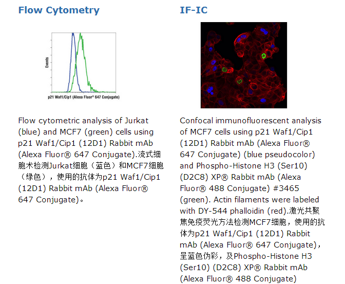 p21 Waf1/Cip1 (12D1) Rabbit mAb (Alexa Fluor® 647 Conjugate) detects endogenous levels of total p21 protein. The antibody does not cross-react with other CDK inhibitors.