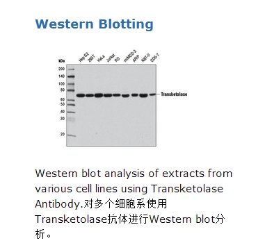 Transketolase(转酮酶)抗体识别内源性的转酮酶总蛋白水平。该多克隆抗体用与人类转酮酶中Val296位点附近的氨基酸序列对应的人工合成肽段免疫动物制成。该抗体使用蛋白A和肽亲和层析纯化制得。转酮酶(TKT),是磷酸戊糖途径(PPP)中的一个二聚体,催化酮糖和醛糖的转化(1,2)。此酶与转醛酶一起,与PPP糖酵解的非氧化分支联系(1-3)。TKT的一些区域在进化上与革兰阴性的细菌和哺乳动物相保守(3)。有证据表明缺氧(4)和非缺氧诱导的HIF1-α(5)增加TKT的表达。因为癌细胞依靠TKT进行核酸的补救合成,因此已有研究开始将TKT抑制剂作为一种新型抗癌治疗手段(5-8)。